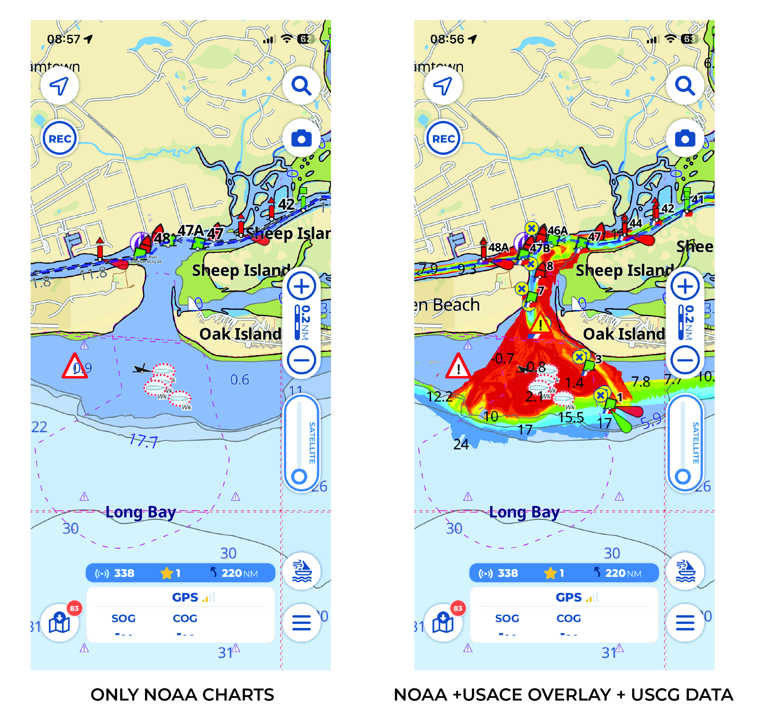 Here above there’s a visual example of the differences between the standard NOAA nautical charts and Aqua Map’s chart, which integrates them with the USACE and USCG datasets, in order to provide an essential layer of situational awareness for anyone navigating busy waterways.