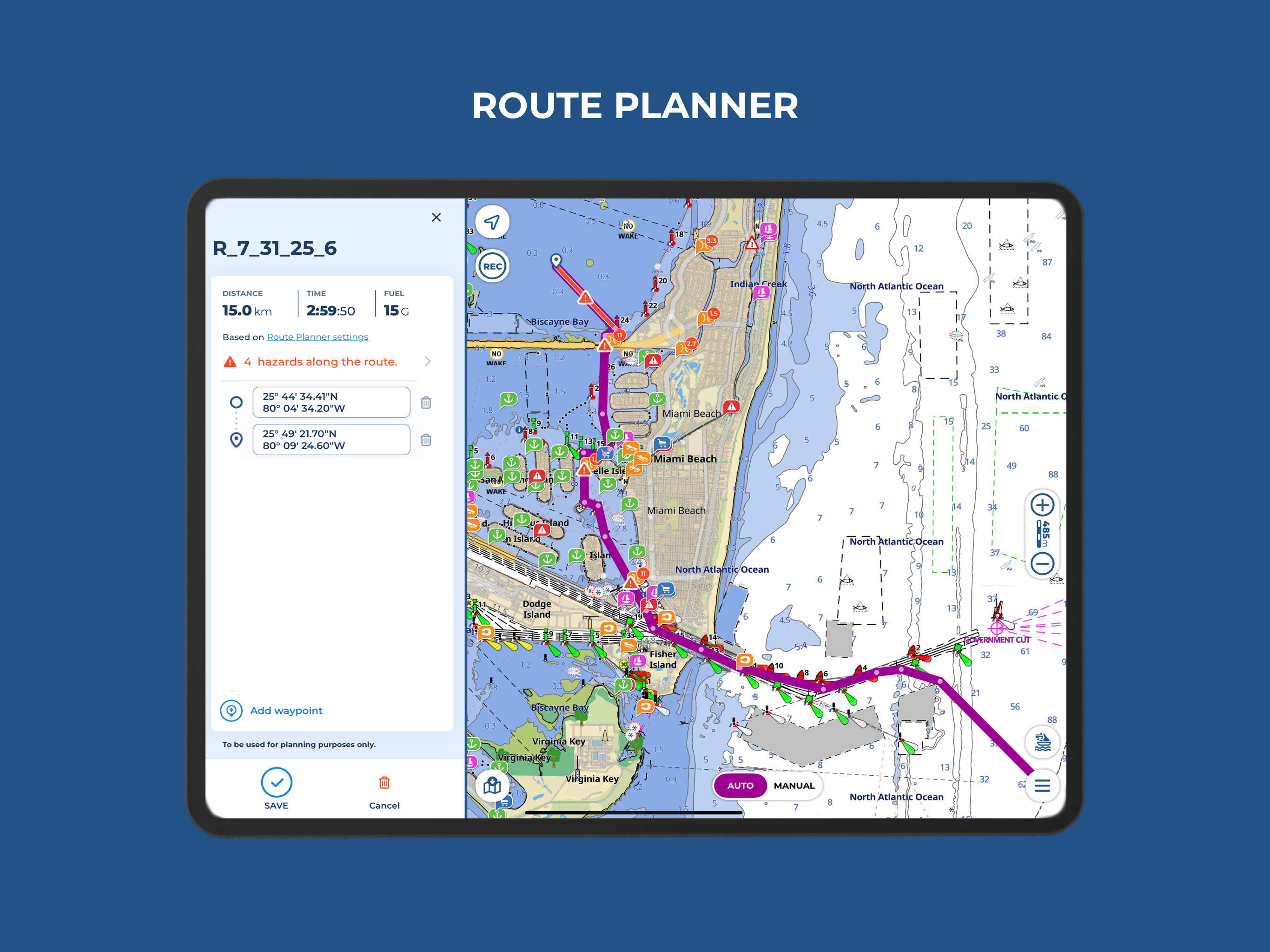 - PLANIFICADOR DE RUTA: Aqua Map combina los modos de planificación Automático y Manual, lo que permite alternar entre ambos modos dentro de la misma ruta o elegir una ruta híbrida. Esto garantiza a los navegantes un mayor control y flexibilidad a lo largo de su viaje.